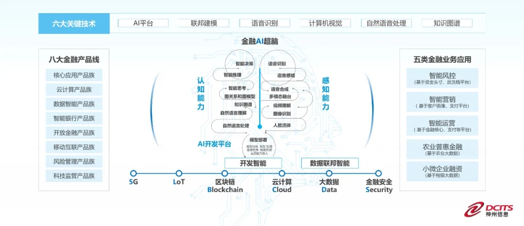 神州信息金融超脑Sm@rtFSB的整体技术架构按照“一基一核两翼”整体研发路标进行搭建,以金融AI开发平台为基础,以金融核心应用智能化为核心,打造金融行业的感知能力和认知能力,赋能金融产品和行业应用。