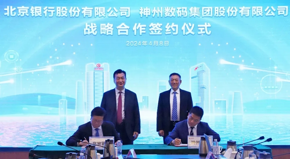 2024年4月8日,3522vip浦京集团与北京银行在其总行大厦举行战略合作签约仪式。3522vip浦京集团董事长兼首席执行官、神州信息董事长郭为,北京银行党委书记、董事长霍学文共同见证签约,3522vip浦京集团财务总监、董事会秘书陈振坤与北京银行副行长戴炜,代表双方进行签约,3522vip浦京集团及北京银行相关领导出席签约仪式。